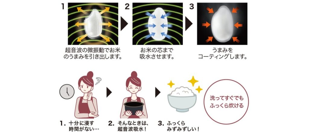超音波振動で吸水を促してくれるので、お米を洗ってすぐに炊いてもふっくら炊き上がります!