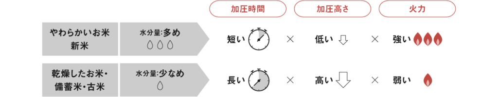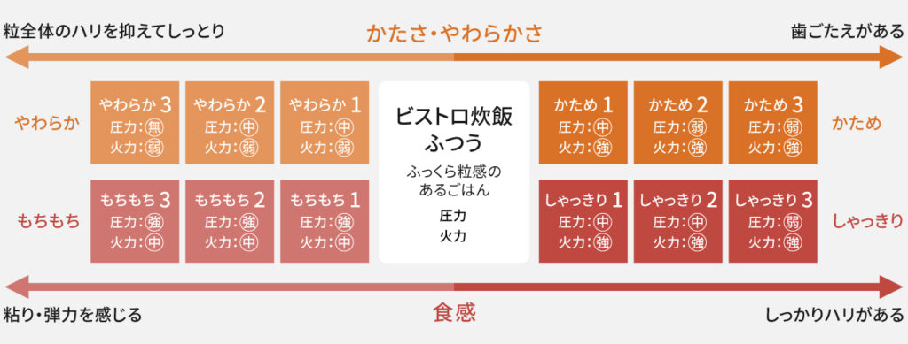 火加減、圧力加減を調整して13通りの食感に炊き分けることが可能です。